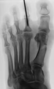 Eine Verkrümmung einer oder mehrerer Zehen führt zu Druckstellen am oben am Schuh scheuernden Mittelgelenk und am sich in die Innensohle des Schuhs bohrenden Zehenendglied.